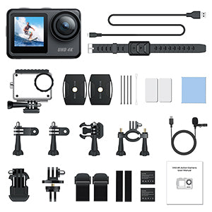 The Campark V40 4k action camera comes with a host of accessories, including two batteries and a charger, a wireless wristb and remote, a waterproof case, an external microphone, bike mount kit, helmet mount kit, cleaning cloth and user manual.