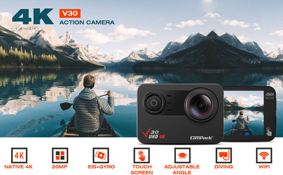 Record high resolution videos at 4K(3840x2160)/30fps and capture 20MP photos, Campark V30 action camera displays gorgeous images and video with superb contrast and clarity down to the finest detail.and it can be used as a webcam