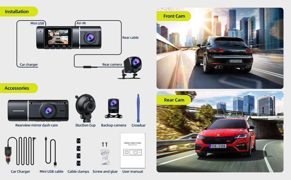 【360° Wide-angle Dash Cam Front and Rear】- The front lens viewing angle reaches 170° and covers five lanes for safe driving. The interior and rear lens and of 150 ° are sufficient to capture a full view of your car's interior and back.