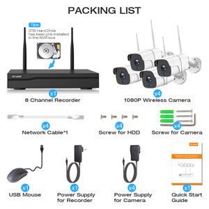 【Pre-install 500GB Hard Drive & Plug-Play】This wireless security camera system pre-install 500GB Hard Drive (maximum supports 8 TB Hard Drive), provides a longer video recording. The 8 CH NVR built-in WiFi router, so you just need to mount the cameras, and plug the camera and the nvr to the adapter respectively, than the devices can be used normally. (Cameras and NVR are paired before shipping)